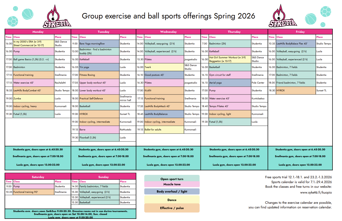 Eastern break: 1.4.-7.4.: No instructed group classes. Open ball sport turns and gyms as usual.